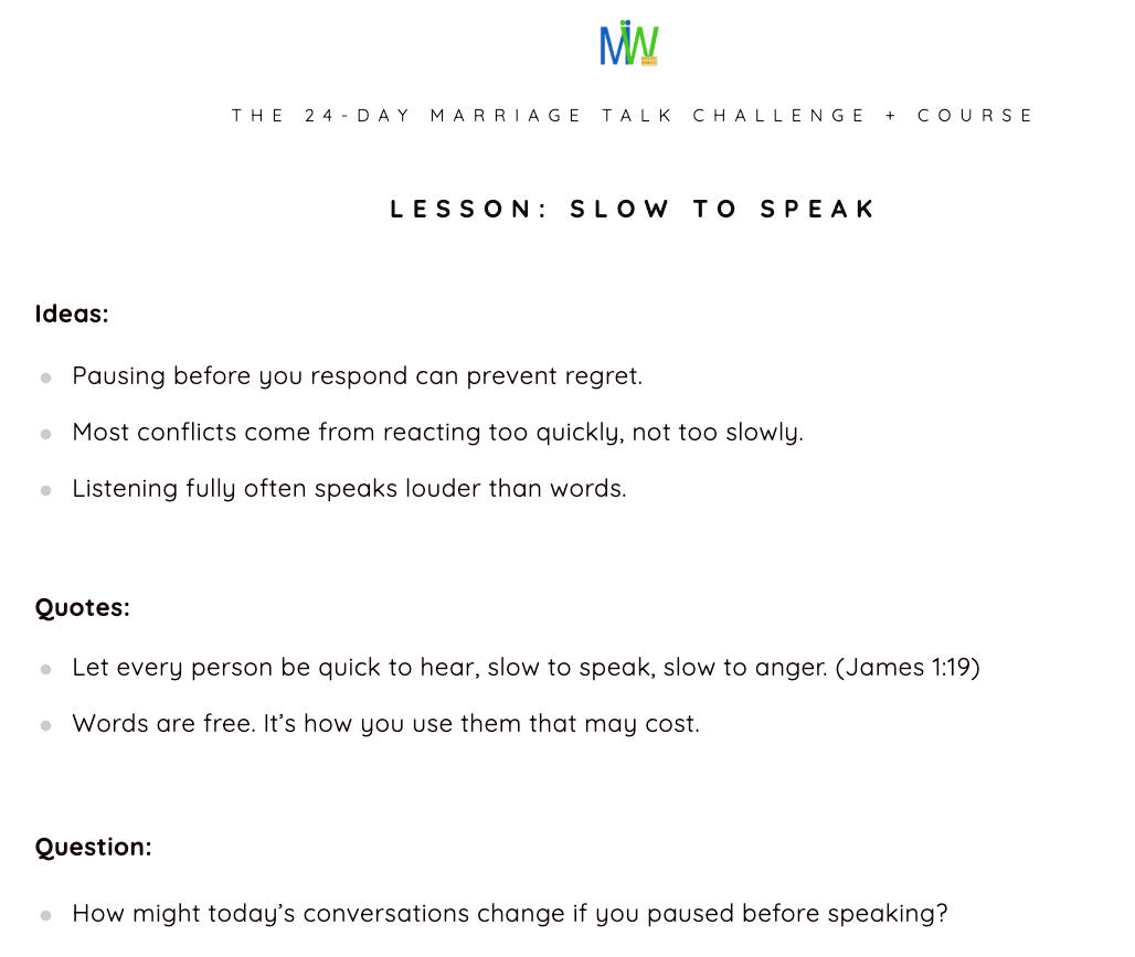 We keep it affordable so any couple can join. For less than the price of one lunch out, you’ll invest in your marriage with a proven plan that lasts far beyond 24 days.